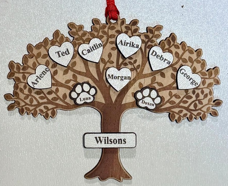 Build your own Family Tree Ornament, including your pets! With this ornament you can enter up to 10 names. People’s names will appear on hearts and Pet’s names will appear on paws. Paws and hearts will support up to and including 9 letters for each name. Simply enter your information below to create your very own family tree ornament that will be appreciated for years to come! If you need more than 10 names, please see our other listing with the Family Tree Ornament where you can enter up to 20 names. Family last name will appear as WHITE PLAQUE on tree trunk, just like primary picture. See gallery pictures to see what these will look like. Also, With your family tree ornament you will also receive a small tube of glue so you can glue your names on your tree wherever you would like! We want you to have the flexibility to place names where you think they look best.