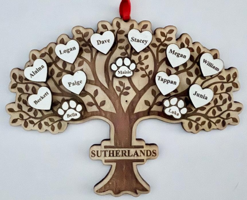 Build your own Family Tree Ornament, including your pets!  With this ornament you can enter up to 20 names.  People’s names will appear on hearts and Pet’s names will appear on paws. Paws and hearts will support up to and including 9 letters for each name. Simply enter your information below to create your very own family tree ornament that will be appreciated for years to come!  If you need less than 20 names, please see our other listing with the Family Tree Ornament where you can enter up to 10 names. See gallery pictures to see what these will look like.  Also, with your family tree ornament you will also receive a small tube of glue so you can glue your names on your tree wherever you would like!  We want you to have the flexibility to place names where you think they look best.