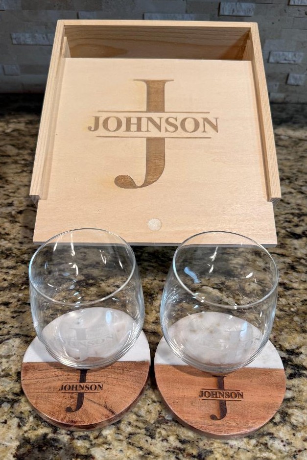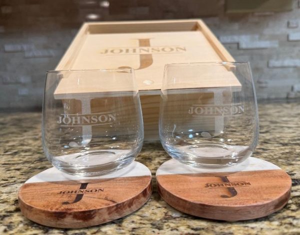 This 5 Piece Gift Box set includes 2 Juice/Rocks Glasses, 2 Four inch marble/acacia wood coasters and a monogrammed gift box. Looking for a personalized closing, housewarming, or wedding gift? You found it! Gift box measures 8 x 8 x 4 and has a lid with a divot for easy slide opening.