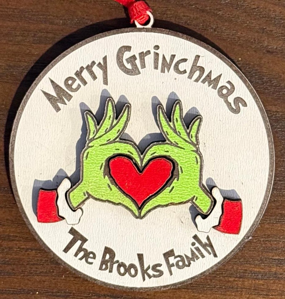 Looking to steal the hearts of your family this year? This Grinch ornament is sure to do just that! Personalize your very own Grinch ornament with your family name. This handcrafted laser engraved ornament measures 2.75” x 3.25″ and features white painted birch wood. Simply enter your Family name in the box below.