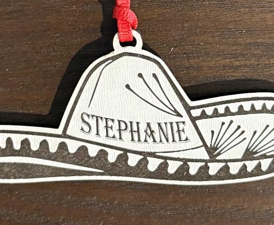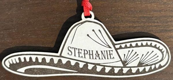 Personalize this laser engraved sombrero ornament with any name or short text of your choice. Check out the gallery picture to see samples of our single layer ornaments.