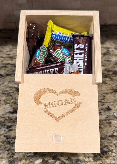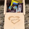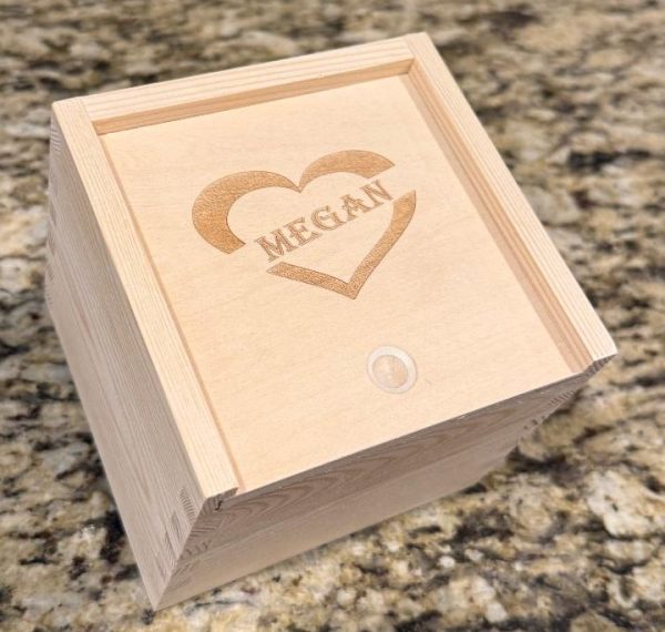 This Wooden Gift Box made from birch wood will be engraved with the heart design and name of your choice. Lid has a circular divot for easy slide opening. Box measures 4.5 inches by 4.5 inches by 4 inches. You are purchasing the custom box only. Fill with whatever you’d like!